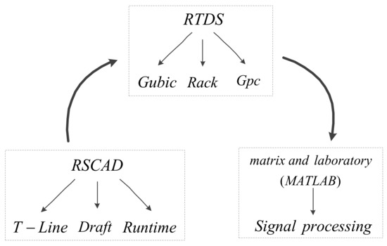 The proposed modeling of harmonics is simulated in real time digital simulation (RTDS). RTDS is a very widely used simulation device around in the world. Compared with other simulation software, RTDS has many advantages of faster calculation speed and the interactivity with practical equipment [31,32,33]. The software platform of RTDS is the real time simulator CAD (RSCAD), and the DFIG model is built in RSCAD software firstly. Then the simulation data is obtained by the operation after connecting RSCAD and RTDS. The simulation process of harmonic modeling in RTDS is shown in Figure 8.