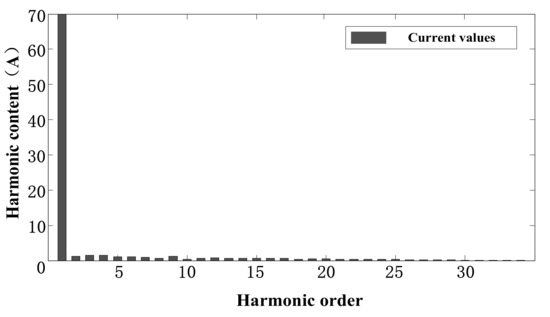 The amplitude () of the current fundamental is 200 A. According to Figure 9, it can be found that there is almost no low-order harmonics in sub-synchronous state, and the simulation resultsalso verify the correctness of the low-order harmonic model of GSC.