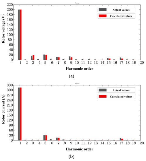 The actual and calculated value of rotor harmonics: (a) voltage harmonics; (b) current harmonics.