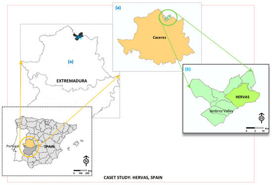 The case study region selected is Hervas situated in Ambroz Valley region of Extremadura Province on the border of the Salamanca Province (Castilla and Leon) and in the foothills of the Bejar and Gredos Mountain in terms of geographical features as depicted in Figure 1. This region as one of 8 municipalities is the pivot of commerce and administration in the Ambroz Valley because of its geographical and social situation. It has abundant and plentiful wetlands and rivers as water resources, essential for agrarian activities. The region covers a multifunctional Agro-Silvo-Pastoral System (ASPS) that is a land-sue system implying the deliberate association of wood components, deciduous forest predominated with the chestnut tree, with cattle and pre-existing agricultural activities in the same site.