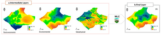 Process of final suitability map (S) with multicriteria GIS-MCDA evaluation of location optimization for biomass facility in the case study region: (a) Intermediate layers and (b) Final layer.