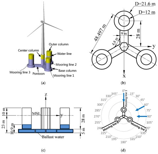 The components and dimensions of the platform are shown in Figure 1b,c along with the coordinate system employed in this study. The pontoons, base columns and outer columns are filled with ballast water to achieve 23 m draft. The wind/wave load directions relative to the platform are given in Figure 1d. It should be noted that the x-axis direction is always consistent with the load direction and the rotor is also yawed to meet the wind accordingly. High-strength lightweight concrete with density of 1900 kg/m3 is adopted for the platform construction. By carrying out preliminary structural analysis, the platform wall of 350 mm thickness is robust enough to resist environmental loads. Furthermore, in order to increase the structural stiffness and separate watertight compartments, stiffeners and bulkheads are arranged inside the platform and considered during the calculation of structural properties, which are summarized in Table 1.