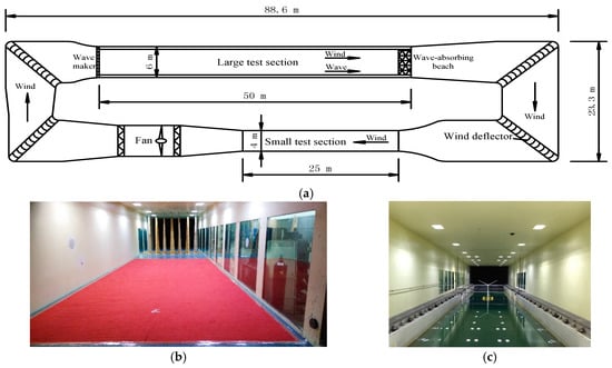 The wind tunnel and wave flume joint laboratory: (a) Plane diagram; (b) Small test section; (c) large test section.