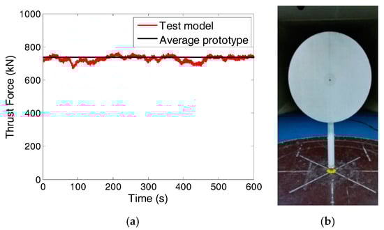 Wind turbine calibration test: (a) Thrust force comparison between the model and the prototype; (b) Simplified wind turbine model for rated operational condition.