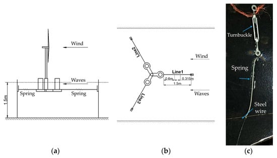 Due to the restriction of the wave flume width, the catenary mooring lines cannot be downscaled directly in its prototype shape. Instead, the equilibrium horizontal spring mooring system was adopted []. It is known that the vertical force is provided by the gravity of the catenary mooring lines and its variation is limited. Hence, it is reasonable to regard the vertical force as a part of the platform ballast system. As Figure 4 shows, three horizontal spring mooring lines were arranged around the platform with a 120° interval angle. Each spring mooring line consists of three parts: a turnbuckle used for pretension adjustment, a spring providing the required stiffness for the system, and a steel wire connected with the platform.