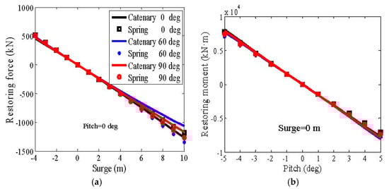 Comparison of (a) the surge-restoring force curves and (b) the pitch-restoring moment curves between the catenary mooring system and the spring mooring system in three load directions.
