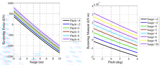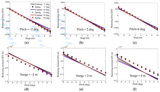 Surge-restoring force curves with pitch motion: (a) pitch= −2 deg; (b) pitch = 2 deg; (c) pitch = 4 deg and pitch-restoring moment curves with surge motion: (d) surge = −2 m; (e) surge = 2 m; (f) surge = 4 m.