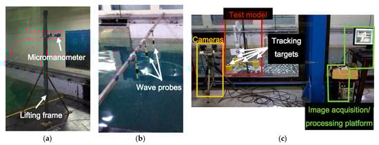 As Figure 7 shows, the wind profile was measured by a micromanometer installed on a lifting frame. Wave elevations were monitored by three capacitance type wave probes. The six degrees of freedom (DOFs) of the FOWT model were captured by an in-house stereo vision measurement system [,], which consists of three parts: two cameras, five tracking targets attached onto the model and an image acquisition/processing platform. Its high precision was demonstrated by comparing results with a laser displacement sensor.