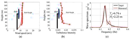 The measured mean wind speed and turbulence intensity profile at the location of the FOWT model are displayed in Figure 8a,b. The simulated wind speed profile is in close accordance with the dashed line, which is the empirical power law profile with a 0.1 wind shear exponent. Since only the averaged thrusts of wind turbine can be modeled by means of the disc, no turbulent wind is generated intentionally in the tunnel. Hence, it is shown that the turbulence intensity at hub height is small (less than 5%). Furthermore, Figure 8c shows the comparison between the measured spectrum and the target Joint North Sea Wave Observation Project (JONSWAP) spectrum. The consistency between the measured and target spectrums, except for the discrepancies around 0.2 Hz which may be caused by the reflected waves from the sidewalls of the flume, indicates that the wave flume is capable of generating the specified realistic ocean condition.