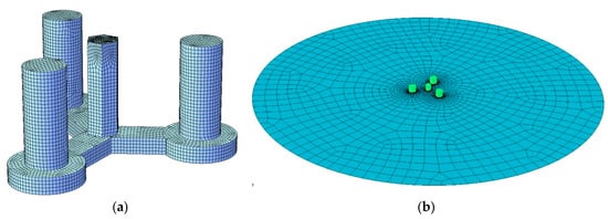 Grids for the hydrodynamics computation: (a) Panel model for the ConFloat semi-submersible platform; (b) Free surface grids.