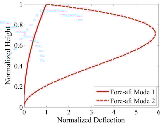 FAST employs an assumed-modes approach to model the tower flexibility and it needs the first two elastic bending mode shapes as well as structural properties to compute modal intergrals for the motion equations of the system. Since the tower mode shapes are strongly affected by the tower-base boundary conditions especially as mounted on a floating platform, the finite-element-method (FEM) based software BModes [] capable of handling the coupled modal issues with complex boundary conditions was adopted in this study. The parameters that related to the tower vibration mode shapes such as the tower mass and stiffness distribution, tower-top mass, floating platform mass, added mass, hydrostaric stiffness and mooring stiffness were served as input to BModes, then the inertial and stiffness matrices of the whole system were constructed. Finally, by solving the eigenvalue problem, the tower fore-aft mode shapes are obtained and plotted in Figure 11. The first- and second-order natural frequencies of the employed turbine tower are 0.444 Hz and 2.949 Hz, respectively.
