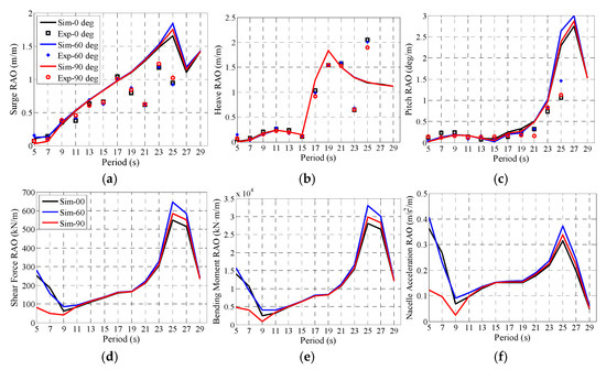 Comparisons of RAOs in three wave headings: (a) Surge; (b) Heave; (c) Pitch; (d) Tower base shear force; (e) Tower base bending moment; (f) Nacelle fore-aft acceleration.