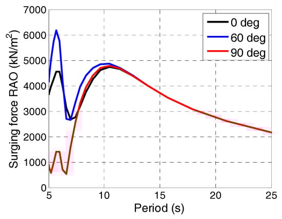 Figure 12 shows the comparisons of surge, heave and pitch RAOs in three wave headings. The surge RAO magnitudes show a good agreement between the simulated and experimental models, and rise with the increase of period from 5 s to 17 s. Beyond the period of 17 s, the test results show a local minimum at 21 s and reach peak at 23 s. However, numerical surge RAO increases continuously throughout the tested periods and drops down to 1.1 at 27 s before rising again at 29 s. Referring to the influences of wave headings, the magnitudes for the 0° and 60° wave are remarkably larger than those for the 90° from the period of 5 s to 9 s. Beyond that range, the surge RAO values are basically the same. This trend can be well explained by Figure 13 in which the surging force RAOs are compared between the three wave directions.