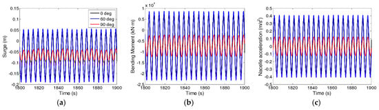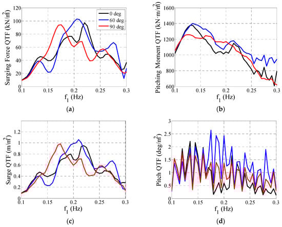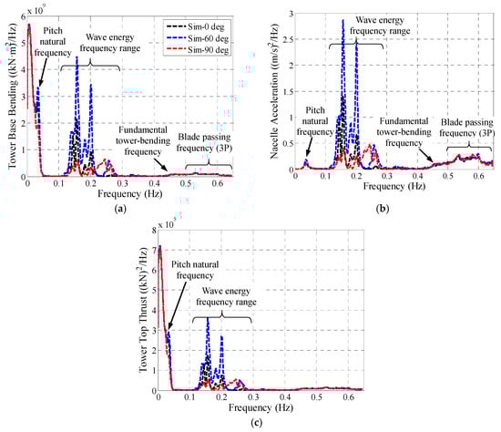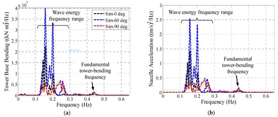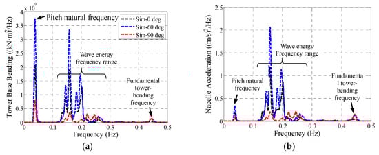 Based on the aforementioned validated numerical models, the fore-aft tower base bending moment Mtwr and nacelle acceleration ancl are also investigated and the simulation results are shown in Figure 20. The wind turbine is excited in three frequency components, i.e., the platform pitch natural frequency, the incident wave frequency and the fundamental tower-bending frequency. Thereinto, the wave-frequency excitation, which is induced by the first-order hydrodynamic loads, is the most significant component for the wind turbine dynamic responses. The largest and smallest Mtwr and ancl PSD values are seen in the 60° and 90° wave respectively. This trend is consistent with the RAO results shown in Figure 12e,f and it is fundamentally correlated to the first-order wave loads in the surge DOF (as Figure 13 shows). Figure 20 also shows that Mtwr is more sensitive to the platform pitch motion compared with ancl. Large Mtwr PSD values are predicted in the pitch natural frequency, which can be explained by the larger moments induced by the gravitational loads as the wind turbine tilts. Once again, the dynamic responses for 60° are larger than the other two directions. Based on the above analysis, it can be appreciated that this part of the difference originates from the second-order hydrodynamic loads. As a whole, both the first- and second-order hydrodynamic loads contribute to the differences of Mtwr and ancl between wave directions. It seems that the former is more influential.