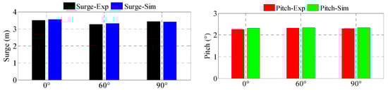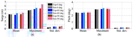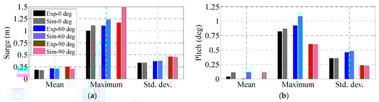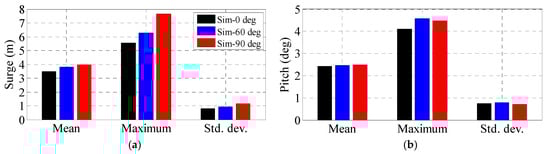 The surge and pitch PSDs in three load directions are compared in Figure 26. Larger surge and pitch PSD values can be observed in the 90° and 60° load heading respectively, which is in accordance with the aforementioned analysis. By comparing with the simplified model (Figure 22), the oscillations of the actual model are much more significant, which demonstrates the important contributions of the rotating rotor and the turbulent wind to the overall response. Similar phenomena can be found in the statistical data shown in Figure 27.