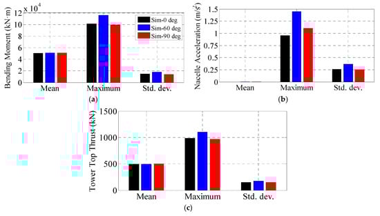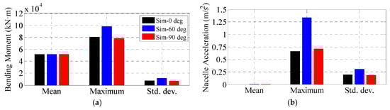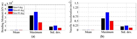As shown in Figure 21, the maximum and standard deviation of the simulated Mtwr and ancl varies a lot with wave directions. The maximum values of Mtwr and ancl in the 60° wave are nearly two times larger than those of the 90° wave, demonstrating the great impact of the wave load directionality effects on the wind turbine dynamics.