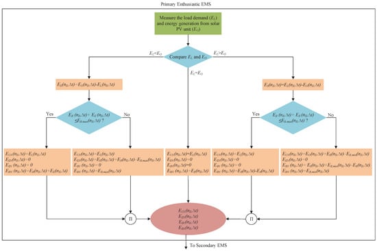 The charging and discharging of batteries depend on the SOC, and these will happen if the condition: is satisfied where is the state of charge of the battery and , are the minimum and maximum limits of the , respectively. In cases of energy excess or shortage from the solar PV unit, the primary enthusiastic EMS will check the current condition of the BESS to see whether the BESS could be charged or discharged and how much energy it can discharge or charge along with the amount corresponding to charging and discharging while maintaining the limits related to the .
