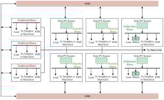 In a traditional power grid, there are different types of houses, which are connected to the main grid, and the total load demand of these houses is usually met by energy supplied from the main grid. However, this is not the case for a microgrid where different types of houses can be connected together along with the grid. In microgrids, the primary aim is not to purchase energy from the main grid, rather satisfying their own demands from the installed renewable energy sources, especially solar PV systems. The houses that can be connected to a microgrid through an EMS can be categorized into the following three types: