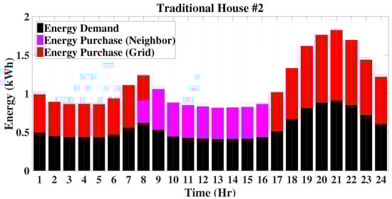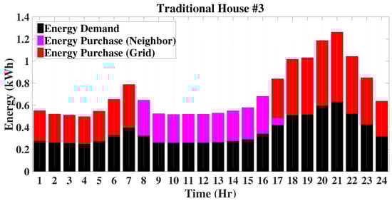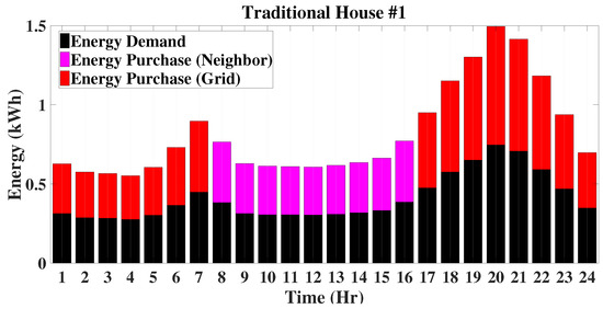 where is the set of traditional houses, represents a variable to denote households in the set of traditional houses and is the total number of traditional houses in the microgrid. Traditional houses do not use any solar PV systems to produce energy and heavily depend on the utility to meet their energy demands. In a microgrid, this set can be considered as the poorest community member who cannot afford the cost of solar PV systems or a person who can afford the cost, but is unwilling to install solar PV systems. The owners of these houses only care about the prices of electricity, i.e., they just look for the least expensive options to purchase energy, and it really does not matter to them from where the energy is coming.