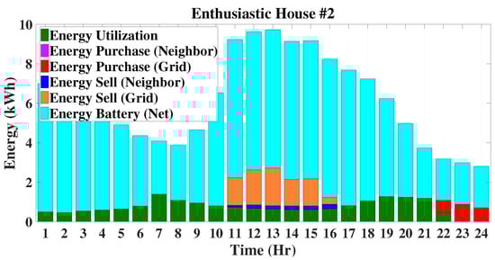 The energy profiles for enthusiastic houses are shown in Figure 17 and Figure 18, from where it can be seen that E1 and E2 operate in this mode from 21:00 h–24:00 h and 23:00 h–24:00 h, respectively. From Figure 17 and Figure 18, it can be seen that there is still energy available from the BESSs while purchasing from the main grid. This occurred as the energy available from the BESSs is the net energy obtained from other cases as discussed in the following.