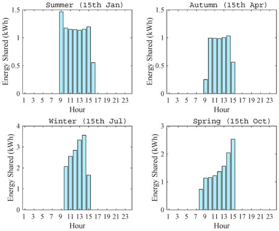 The energy sharing with the proposed hierarchical EMS in a representative day for four seasons is shown in Figure 20. The highest energy sharing occurs on 15 July among the four cases as shown in Figure 20. The energy sharing in the spring is comparatively lower than the winter. Although the energy generation is the lowest during winter, the high demand together with energy availability for sharing results in the highest energy sharing during this particular day. The net annual energy profile of the microgrid is shown in Table 7 from where it can be seen that the proposed transactive energy sharing scheme would allow up to 31% grid independent operation of the microgrid.