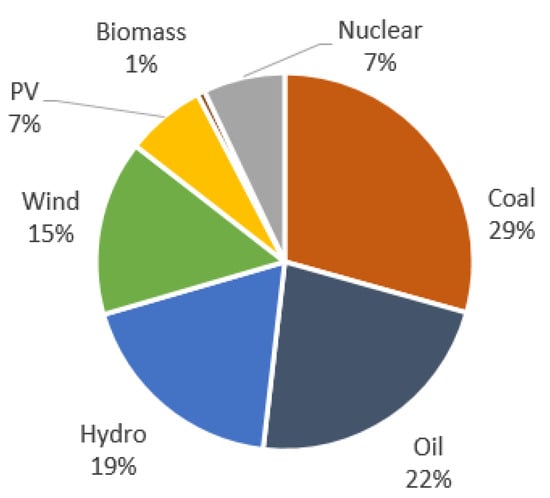 Romania has significant oil and gas reserves, substantial coal deposits and hydro resources. Romania partly imports oil and gas from Russia and other countries. Currently, the structure of installed power (Pi) is about 29% coal, 22% oil, 19% hydro, 7% nuclear, 15% wind, 7% PV and 1% biomass [], as shown in Figure 1.