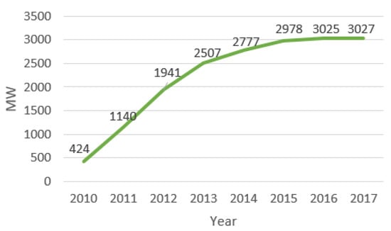 In November 2017, WPP reached installed capacity of 3027 MW [], as in Figure 2, from the 14 MW installed capacity in 2009, which is a remarkable improvement. However, in the last years (since 2015) the increase of WPP installed power was very slow.