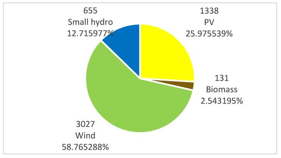 Wind energy is the most developed RES in Romania, the WPP installed power representing around 60% of the total RES installed power. Also, PV is the second most developed RES in Romania, having an installed power of about 1338 MW [] and representing about 26% of the total RES installed power, as in Figure 3.