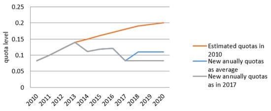 In Figure 4, changes in annual mandatory quotas are depicted. From 2017, we estimated the evolution of mandatory quotas as if they remain unchanged from 2017 to 2020 (grey line) or as average (blue line). However, due to the fact that the RES integration target is constantly rising by the EU policy, we expect that the mandatory quotas will rather follow or be above the blue line.