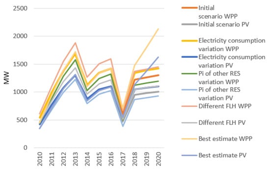 In case the proportion of the other RES increases in total green consumption, it is obvious that the installed power of WPP and PV that would benefit from promoting scheme will decrease. This scenario is fully described in Table 5.