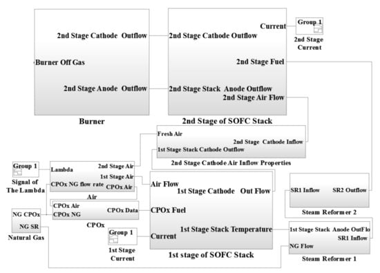 A complete concept of the designed model of two stage SOFC stacks power generation system is represented as a block diagram in Figure 2. The air block defines the molar flow rates of the air entering the CPOx reformer, the first stage cathode and the second stage cathode. The amount of air entering the CPOx reformer was calculated based on the lambda number and the CPOx natural gas inflow rate. The physical parameters of the 1st stage fed fuel was calculated by the CPOx reformer block. The inputs were the CPOx inflow rate, inflow molar fraction, temperature of the flow and pressure. The fuel and air flows were mixed before the CPOx reformer inlet.