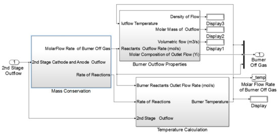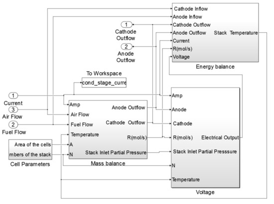 The block diagram of the 1st and 2nd stage SOFCs consisted of three main sub-systems: mass balance, energy balance and voltage. The 1st stage SOFC stack model block example is shown in Figure 3.