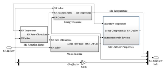 Both reactions are reversible and due to the high temperature of the reforming process, the reactions reach equilibrium conditions over an active catalyst very fast. Thus, the actual composition of the outflow leaving the steam reformer is a factor of the reactor temperature and operating pressure as well as the composition of the feed gas [28]. In order to produce more amount of hydrogen, carbon monoxide and steam take part in the reversible exothermic water gas shift reaction. The implemented thermal energy balance for the steam reformer was calculated as follows (Equation (21)):