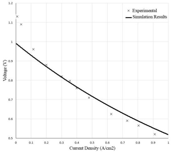 In order to validate the accuracy of the SOFC model, the calculated V-I curve for the single cell at the steady state simulation was compared with a set of experimental data as presented in Figure 6. The calculated current—voltage polarization curve of the SOFC was close to the experimental results at current densities between 0.1 to 1 A cm−2. The maximum error in this range was equal to 5.2%. The V-I results at the current densities lower than 0.1 A cm−2 were lower than the experimental one. The reason for weaker agreement with data [32,33] in that region is linearization of the open circuit voltage equation applied in the SOFC model in order to simplify it.