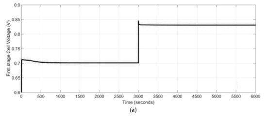 where is the standard cell potential; and are the partial pressure of hydrogen, oxygen and steam, respectively; R is the universal gas constant; F is the Faraday number; N is the number of the cells in the stack and Te is the stack temperature [29].
