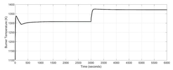where , V and are the density, volume of the burner chamber and specific heat of gases inside the burner volume, respectively. are molar flow rates of the hydrogen, carbon monoxide and methane entering the burner, while are the specific heats of reaction. is the specific heat of the reactants entering the burner, and are the molar flow rate of the reactants entering and exiting the burner.