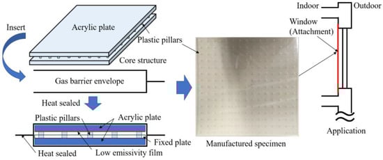 Most models of conventional VIPs include a core material with a low-thermal conductivity coating of a gas barrier film (in particular, aluminum foil), and they are always used in refrigerators and thermoses. In current good building practices, windows are considerably less well-insulating than other parts of a structural envelope. The necessity to reduce energy consumption requires a greater use of smaller windows than may be architecturally or aesthetically desirable, which in turn reduces the potential for solar gain in cold climates. Therefore, the study of vacuum insulation technology that is applied to buildings has been performed since the 1990s. A representative study of the vacuum insulation technology is the study of vacuum glazing by R. E. Collins [,,,,,,]. In the corresponding research, pillars are used between two pieces of glasses to form a vacuum layer, and a low emissivity (low-e) film is employed to reduce the thermal emissivity, which is approximately 0.9 for glass []. Then, the durability of the pillars is investigated and their influence is discussed []. The cost to produce the vacuum glazing is compared with a model in which argon is filled in a pair glass with a low-e film, and the result shows a 25% increase in the cost.