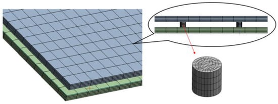 An element of the VIP is selected to represent the calculation conditions. The calculation conditions and specific size of the VIP for the standard model are also depicted in Figure 12. In this calculation, the thermal conductivities of the plastic cylinder (pillar) spacer, acrylic plate, and vacuum layer are 0.3 , 0.2 , and 0.106 (the thermal conductivity can be calculated by Equation (12)) [,], respectively, and the thermal emissivities of the acrylic plate and low-e film are 0.9 and 0.3, respectively. The temperature difference for the calculation is 25 °C.