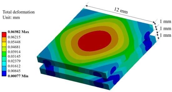 Subsequently, to confirm the structural design, the authors also generate a 3-D model using the simulation software, “ANSYS workbench” (14.0, ANSYS, Canonsburg, PA, USA). The fixed boundary condition indicates that the element analysis is reasonable for a full-size VIP and the meshing in Figure 5 shows that the calculation result is fairly accurate due to the total of 14,039 nodes and 2808 elements. The distribution of the total deformation for the VIP element that is modelled in Figure 2B is shown in Figure 6. The result can validate the mechanical analysis, indicating that the structural design is strong enough to keep the vacuum layer sufficiently flat for the application.