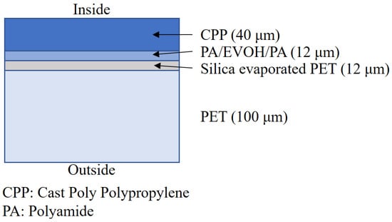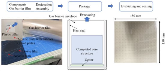 The VIP test specimen is produced as per the flow in Figure 8. The components are installed in a core structure initially and a low-e film covers the surface of the core structure, which is then inserted into a transparent gas barrier envelope. In order to prevent degradation with time, a calcium oxide getter is sealed together with the core material. The getter absorbs gas and effectively prevents performance degradation. For the evacuated insulation material, the air tightness is critical and the components of the gas barrier film are depicted in Figure 9. There are three reasonable transparent evacuated insulation products: silica aerogel core material VIP, vacuum glazing, and the VIP we developed. In keeping with the economic considerations of retrofitting insulation to existing buildings, a reasonable product also requires a good cost-performance; Figure 10 shows the comparison of the industrial manufacture cost of these three insulation products. Silica aerogel core material VIP here is our experimental batch, not a commercial product; however, the cost of silica aerogel is very expensive. The NSG-group is the most famous vacuum glazing supplier, and the cost of vacuum glazing can be seen on their website in Figure 10.