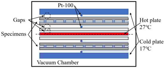 The guarded hot plate (GHP) method is considered because it is a satisfactory method for measuring very low thermal conductivities []. In particular, a vacuum GHP (VGHP) apparatus is manufactured to eliminate the residual gas conduction. A VGHP can maintain a high vacuum level (below 10−4 Pa), leading to the effective measurement of thermal conductivities.