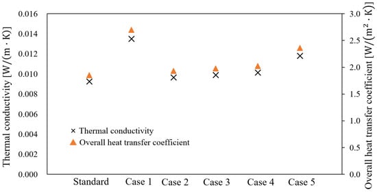 The comparison of the results from the case studies is shown in Figure 14. The calculated thermal conductivity in Case 1 is higher than that in the standard case owing to the higher thermal emissivity. It seems that thermal conductivity can be improved further by an additional low-e film set; however, considering the cost of components and improvement of insulation performance, only one low-e film is enough. Case 2 shows a better performance because the multiple layers cause the thermal conductivity of the vacuum layer to become half that of a single layer. In this way, multiple layers can achieve a similar performance at a lower pressure; however, the thickness will increase. In Cases 3 and 5, the thermal conductivity of the vacuum layer decreases with the reduction in pressure. The standard case has the lowest thermal conductivity when compared with Case 4 owing to the low-emissivity effect. In summary, the most reasonable design should be in standard models as follows: a pressure of 0.1 Pa can achieve a good insulation performance or at a higher pressure with multiple layers, and the model is then covered with a low-e film to control the emissivity and coated with a gas barrier film. The arrangement of spacers should be in the span of 10 mm, which holds a vacuum layer structurally with a small thermal bridge.