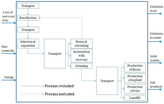 This includes the transport from the store selection until retreading. In the precured tread, which was to be assembled in the process of retreading, a tire casing have been previously prepared. Adapted from [3,30]. See Table 2.