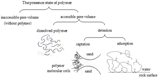 During the development of an oilfield, oil recovery can be improved obviously by injecting polymers [1,2,3,4,5] into the formation, and some scholars have provided extensive reviews of the polymer concentrations, viscosities, and bank sizes used during existing and previous polymer floods. It is believed that the polymer flooding technology needs to be improved in many aspects, such as the risk of mechanical degradation, the produced fluid processing, the large number of polymers remaining in the formation after polymer flooding [6,7], and so on. The residual polymer will be industrial waste if it is not fully utilized. Furthermore, a large gap will occur between predicted results and the actual situation without experimental evidence since the dynamic prediction needs to be adjusted according to the experience of the reservoir engineer [8]. The distribution of the polymer in the formation is affected by many factors, such as heterogeneity [9], polymer concentration [10], polymer molecular weight [11], injection rate [12] and so on. Clarifying the distribution of polymers can provide the criteria for the next step to fully utilize the residual polymer. The presence [13,14,15,16] of polymers in porous media can be divided into two parts: polymers in the inaccessible pore volume (VIP) or polymers in the accessible pore volume. The latter has two states: detention [17] (including adsorption and captation) and dissolved polymers, which is shown in Figure 1. The inaccessible pore volume occurs primarily because polymer molecules are large relative to solvent molecules and pores in the reservoir rock [18]. The VIP for polymer flooding has both positive and negative effects [19,20]. It is known that VIP affects the rate of movement of polymer molecules through the medium. It is also probable that solvent interactions affect the flow and dispersion of solvent in which the polymers are dissolved. Table 1 shows a model [21], which depicts the serious impact of VIP on the polymer flooding development index and on deciding follow-up operations. However, due to the complexity of the experiment, the VIP is hardly measured with the requirement for adjustment of parameters in the numerical models. If the VIP is not chosen to be a suitable value, it will lead to an inaccurate prediction of the polymer breakthrough time [22].