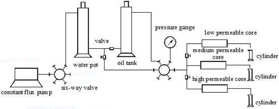The temperature is set at 65 °C, which is under the reservoir conditions, while the injection rate is 0.5 mL/min. Parallel cores were used to determine the effect of heterogeneity on the polymer distribution, with the schematic drawing of the flow shown in Figure 2. The testing procedure includes the following steps. ① Fill the pack with sand and obtain the dry weight, before saturating it with water, measuring the wet weight and calculating the pore volume. ② Flood with water and measure the permeability after the pressure is stable, with the permeability of cores being 300 × 10−3 μm2, 900 × 10−3 μm2 and 2700 × 10−3 μm2 respectively. ③ Inject the oil into the core to establish irreducible water saturation (short for Swi). ④ Install the three cores in parallel and flood with water until the water cut is 98%. ⑤ Inject the polymer solution at 1500 mg/L to a maximum of 0.57 PV. According to the oilfield development plan, the injection process will be ended after injection of the 0.57 PV polymer. ⑥ Record the fluid output volume of each core, which is equal to the injection volume of the polymer.