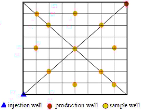 The three-dimensional slab model was used to measure the polymer’s viscosity and concentration distribution after polymer flooding, with the model parameters shown in Table 4. The model and well spacing pattern is shown in Figure 3. The test procedure involves the following steps. ① Measure the dry weight of the model. ② Saturate model with water, measure the wet weight of the model and calculate the pore volume of the model. The value of pore volume equals the ratio of the difference between wet weight and dry weight to water density. ③ Calculate the initial oil saturation (short for Soi) after injecting the simulated oil in the model, which equals the ratio of volume of injected oil to pore volume of the model. ④ Inject polymer solution at 1500 mg/L to a maximum of 0.57 PV. ⑤ Take the samples from the sampling wells, before measuring the viscosity and concentration. ⑥ Draw the isograms of viscosity and concentration using Sufer8.0 software (Golden Software, Golden, CO, USA).