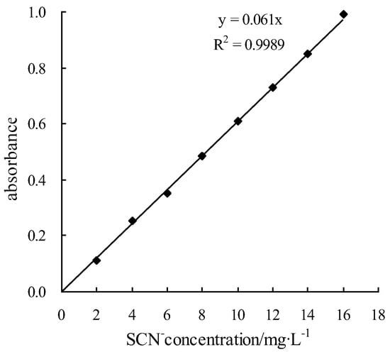 The spectrophotometer method [27] was applied to determine the concentration of the potassium thiocyanate tracer, with the tracer concentration–absorbance standard curve shown in Figure 5.