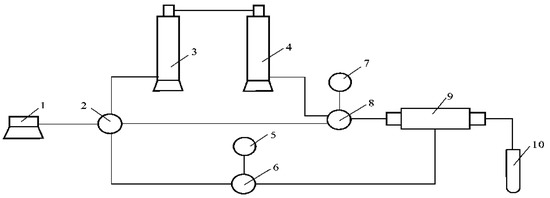 Double-slug experiments measuring the inaccessible pore volume. (1 = constant-flux pump; 2 = six-way valve; 3 and 4 = Intermediate container; 5 and 7 = precision pressure gauge; 6 and 8 = seat; 9 = core holder; and 10 = measuring cylinder).