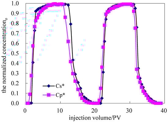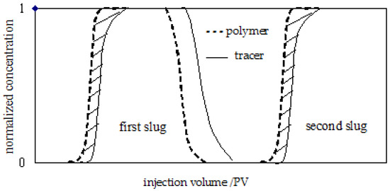 The experiments described in this paper were all single-phase displacements of polymer solutions through consolidated sandstone. All the cores were prepared by evacuating and saturating with brine, with the pore volumes of the cores measured at this time. The experimental floods reported were conducted in severe steps, as depicted in Figure 6. The test procedure included the following steps. ① Prepare 500 mg/L polymer solution and select potassium thiocyanate (short for KSCN) as the tracer at a concentration of 300 mg/L. ② Blend the 1750 mg/L polymer solution and 300 mg/L KSCN solution, before injecting the first mixed fluid slug into the core. ③ Monitor the pressure changes and sample the outflow mixed fluid, before determining the concentration of polymer and thiocyanate root (short for SCN−). ④ Continuously inject the mixed fluid system until the pressure is stable, before injecting the formation water until there is no polymer in the effluent. ⑤ Inject the second mixed fluid slug into the core, which contains 500 mg/L polymer solution and 300 mg/L KSCN solution. ⑥ Monitor the pressure changes and sample the outflow of mixed fluid, before determining the concentration of polymer and SCN−. ⑦ Continuously inject the mixed fluid system until the pressure is stable, before injecting the formation water until there is no polymer in the effluent. The schematic diagram of the experimental results is shown in Figure 7. Although the tracer dissolves in the polymer solution, the curve is still separated. Two reasons lead to the first slug separation, one is the inaccessible pore volume caused the forefront of the polymer slug advance to break through, the other is the detention caused the forefront of the polymer slug to be delayed. Separation of the second slug was caused by the inaccessible pore volume. In Section 3.2.1, we will explain the reason why in detail and explain how to get the parameters for VIP and polymer retention.