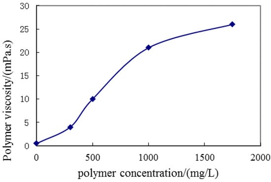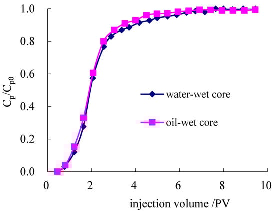 Using cores with the same specifications as in Section “Dynamic Retention of the Polymer”, which were saturated with methyl silicone oil for 48 h, the wettability reversed. The oil film limited the polymer adsorption in the rock surface [29]. The polymer solution with a concentration of 1750 mg/L was used for polymer flooding and the method of measuring retention was used in the experiment. The results are shown in Figure 12. The difference between the integration of two curves was the dynamic adsorption capacity. The dynamic adsorption was 43.4 μg/g, accounting for 63.6% of retention.